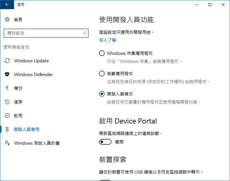 - 首先你要到設定中,「更新與安全性」裡頭的「開發人員專用」下面,打開「開發人員模式。」